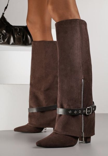 Brązowe Kozaki na Obcasie Typu Kowbojki z Wywiniętą Cholewką i Paskiem z Klamrą Uninela
