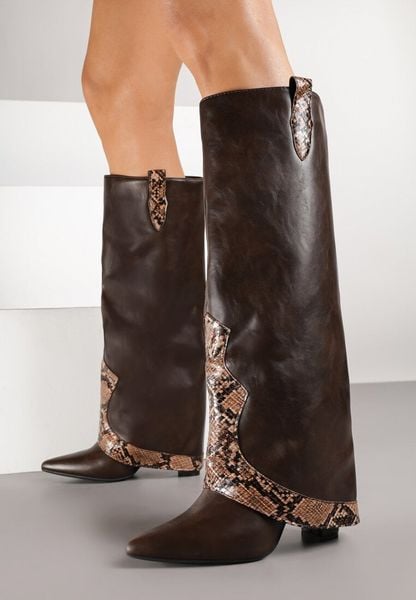 Brązowe Kozaki na Słupku z Cholewką Imitującą Nogawkę z Wężowymi Wstawkami Ferrota