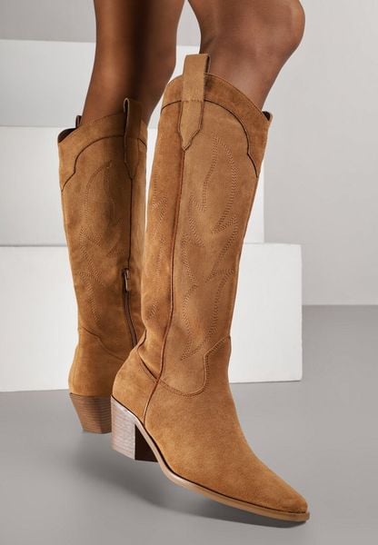 Jasnobrązowe Kozaki Kowbojki na Stożku z Haftem na Cholewce Gallessa
