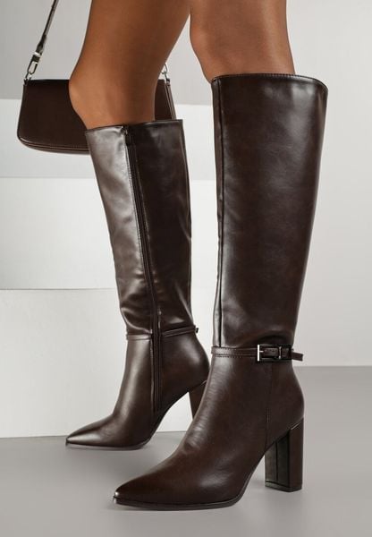 Brązowe Kozaki na Słupkowym Obcasie z Noskiem w Szpic i Klamerką na Pasku Levitta