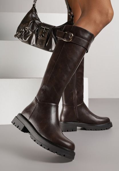 Brązowe Kozaki Typu Oficerki z Zaokrągloną Klamrą Unessia