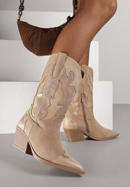 Ciemnobeżowe Kozaki Kowbojki na Stożku z Tłoczoną Cholewką Avrenne