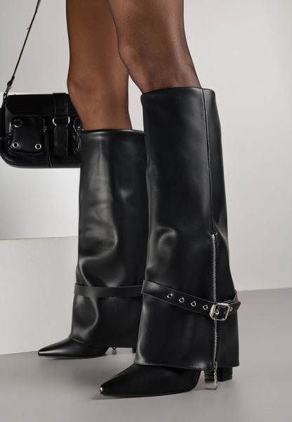 Czarne Kozaki na Słupku z Cholewką Imitującą Nogawkę z Klamerką i Suwakiem Fenneia
