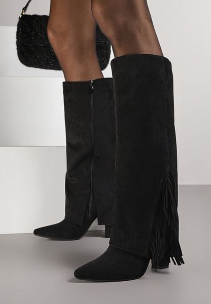 Czarne Kozaki na Słupku z Wywiniętą Cholewką z Frędzlami Linadela