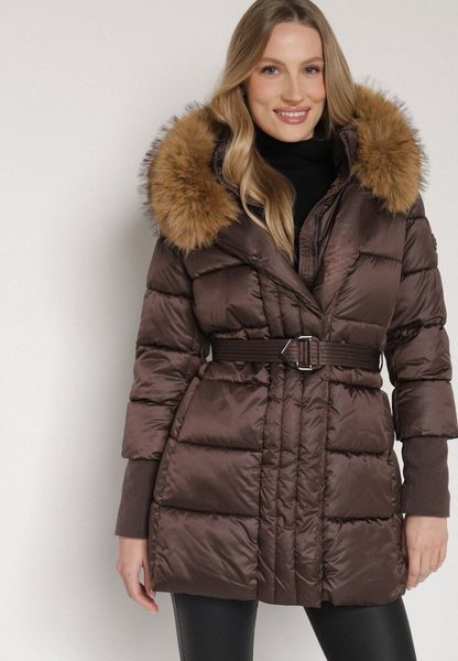 Brązowa Kurtka z Pikowanymi Przeszyciami Paskiem i Kapturem z Futrem Lidanessa