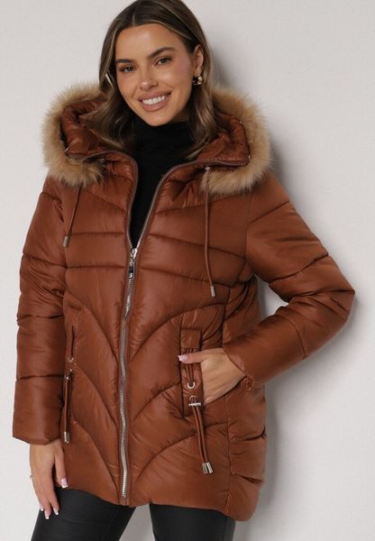 Brązowa Pikowana Kurtka o Trapezowym Kroju z Kapturem i Odpinanym Futerkiem Deolaine