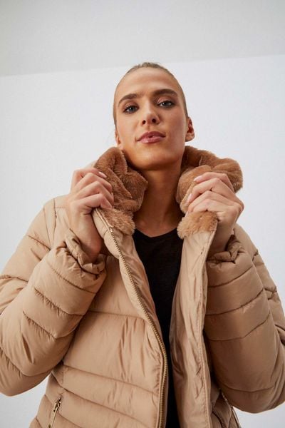 100% POLIAMID Kurtka, brązowy, beżowy, bez wzoru, gładki, poliamid, z futrem, pikowanie, ocieplenie, pikowana, długi rękaw, Z kapturem, Zapięcie, zamek, do bioder,