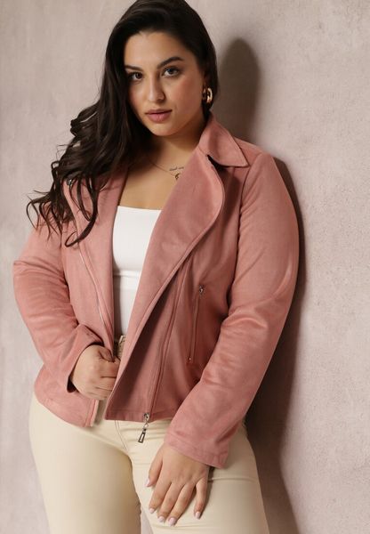 Ciemnoróżowa Asymetryczna Kurtka Ramoneska z Imitacji Zamszu Kmiya