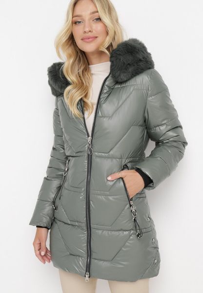 Ciemnozielona Pikowana Kurtka z Kapturem i Futerkiem Sahria