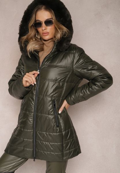 Ciemnozielona Pikowana Kurtka z Odpinanym Kapturem i Futerkiem Bellafi