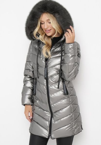 Srebrna Pikowana Kurtka z Kapturem Ozdobionym Futerkiem Kavenna