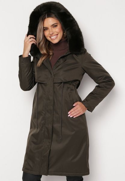 Zielona Kurtka za Kolano ze Ściągaczem i Kapturem z Futerkiem Adoresa