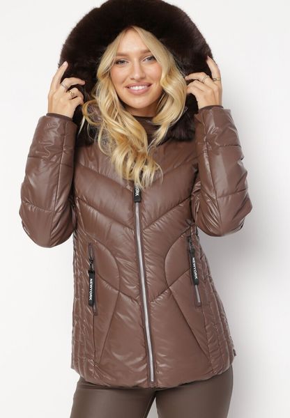 Brązowa Pikowana Kurtka z Kapturem Ozdobionym Futerkiem Caelara