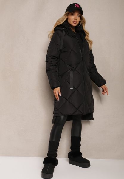 Czarna Pikowana Kurtka z Przeszyciem w Kratę Kapturem i Kieszeniami Zenetta