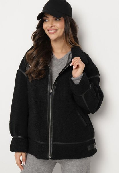 Czarna Kurtka Oversize z Futerka Typu Baranek z Wysokim Kołnierzem z Paskiem z Klamrą Torisha