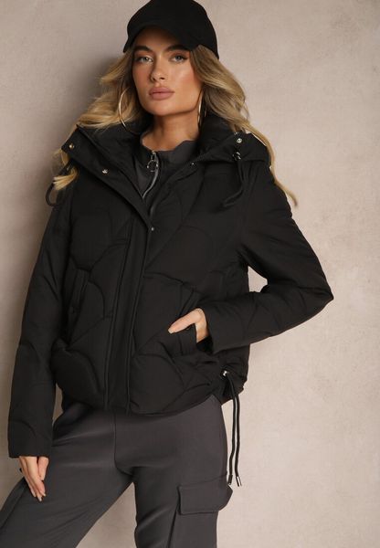 Czarna Pudełkowa Kurtka Zdobiona Pikowanymi Przeszyciami z Kapturem i Ściągaczami Ziasha