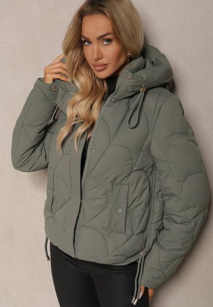 Ciemnozielona Pudełkowa Kurtka Zdobiona Pikowanymi Przeszyciami z Kapturem i Ściągaczami Ziasha