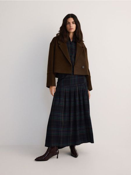 Kurtka o krótszym kroju, wykonana z tkaniny z wełną.