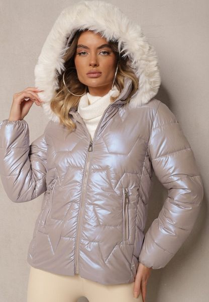 Fioletowa Pikowana Kurtka z Metalicznym Połyskiem z Kapturem Wykończonym Futrem Ravithrae