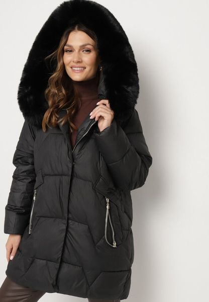 Czarna Pikowana Kurtka o Pudełkowym Kroju z Odpinanym Futerkiem i Ozdobnym Suwakiem Hedilina