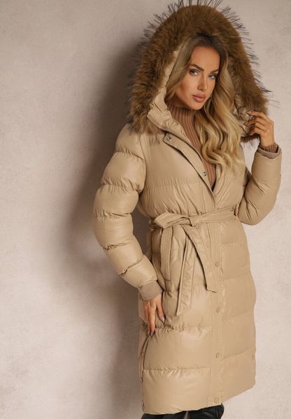 Beżowa Kurtka Pikowana o Długim Kroju z Kapturem Wiązana w Pasie z Odpinanym Futerkiem Phorira