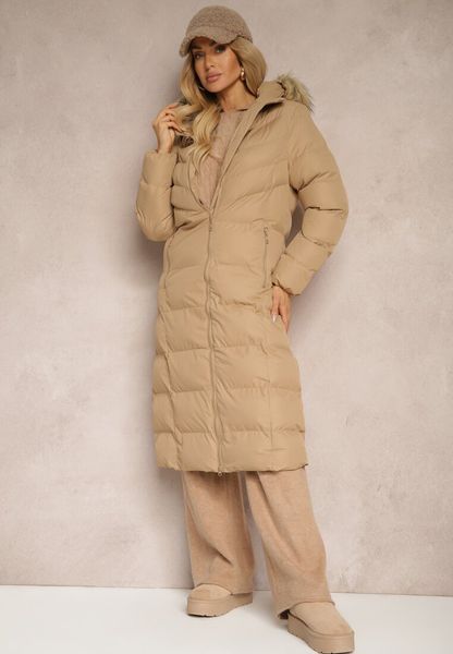 Beżowa Kurtka Zimowa z Pikowanymi Przeszyciami i Kapturem z Futrem Alirina