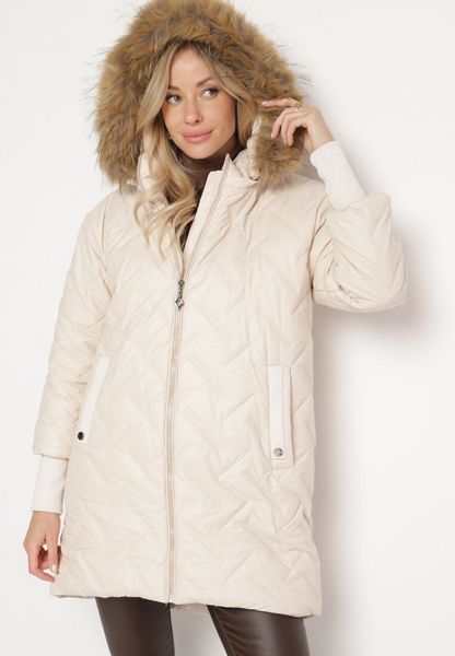 Jasnobeżowa Pikowana Kurtka z Odpinanym Kapturem i Futerkiem Ozdobiona Ściągaczami Ellonaria