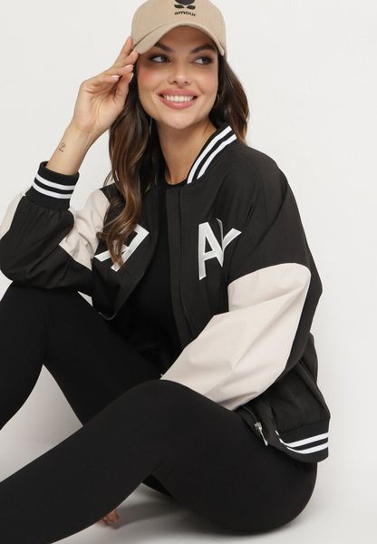Czarna Kurtka Bomberka o Kroju Oversize z Paskami i Napisami Nevilora
