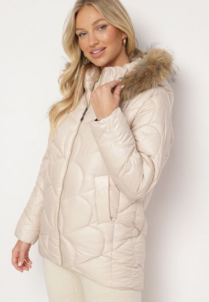 Jasnobeżowa Kurtka z Ozdobnymi Pikowanymi Przeszyciami i Kapturem z Futerkiem Cyrinna