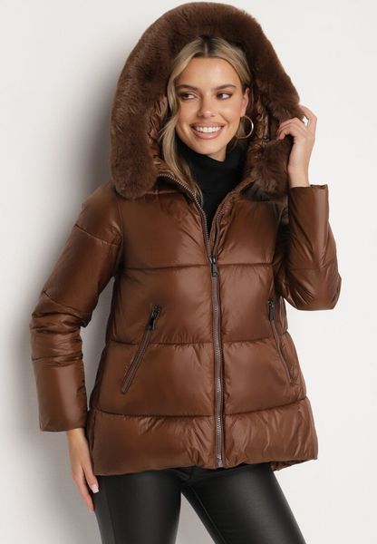 Brązowa Pikowana Kurtka z Dłuższym Tyłem i Futerkiem przy Kapturze Verrira