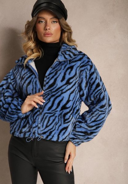 Niebieska Kurtka Futerko w Zebrowy Print ze Ściągaczem i Kieszeniami Felremi