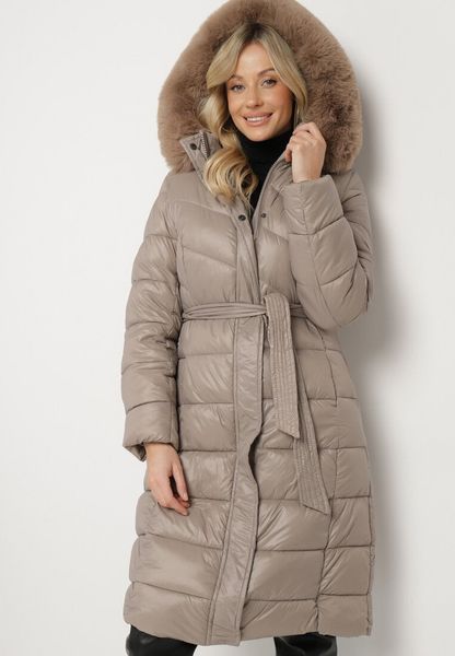 Beżowa Pikowana Kurtka o Długim Kroju z Odpinanym Kapturem z Futerkiem i Paskiem oleti