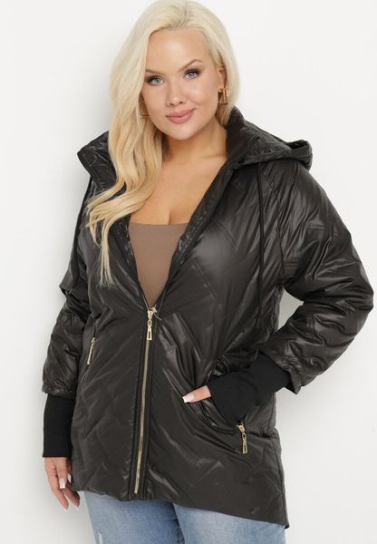 Czarna Kurtka Pikowana z Odpinanym Kapturem z Dłuższym Tyłem Rivselia