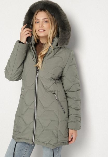 Zielona Klasyczna Kurtka z Pikowanymi Przeszyciami i Kapturem z Futerkiem Raffisa