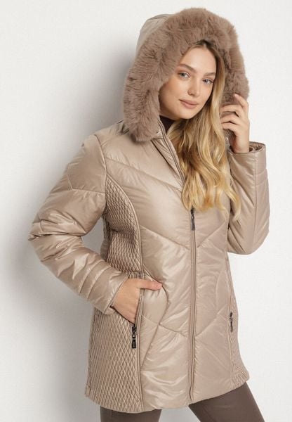 Beżowa Kurtka z Pikowanymi Przeszyciami i Kapturem z Futerkiem Vevea