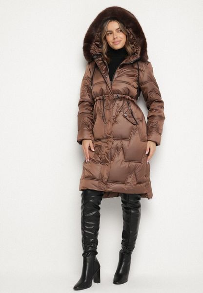 Brązowa Pikowana Kurtka o Długim Kroju ze Ściągaczem w Talii i Kapturem Galita