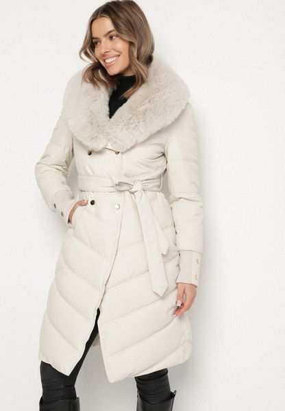 Biała Elegancka Kurtka z Pikowanymi Przeszyciami i Futrzanym Kołnierzem Gallea