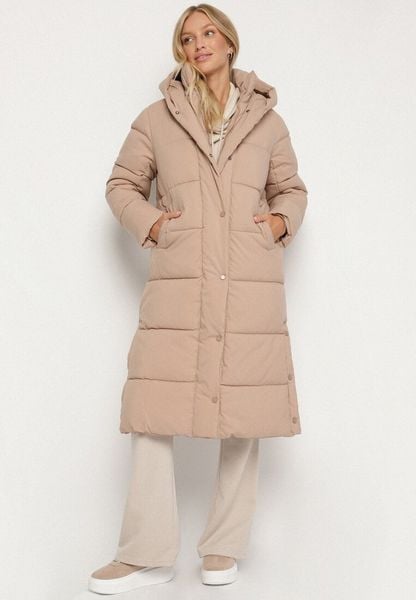 Beżowa Pikowana Kurtka Zimowa z Kapturem i Rozcięciami na Napy Acalte