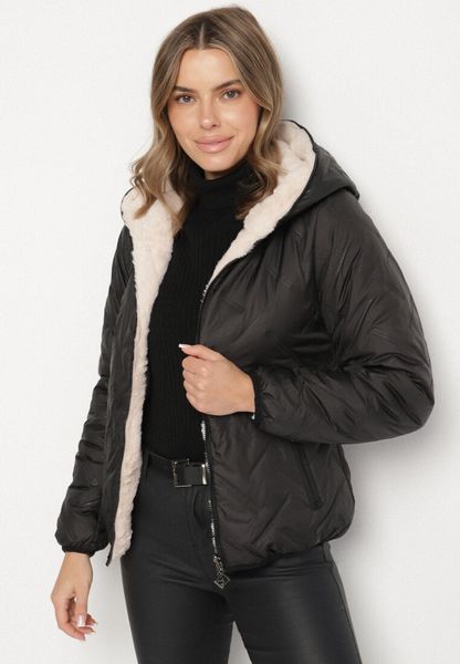 Czarno-Beżowa Pikowana Kurtka z Kapturem o Dwustronnym Kroju Tahalia
