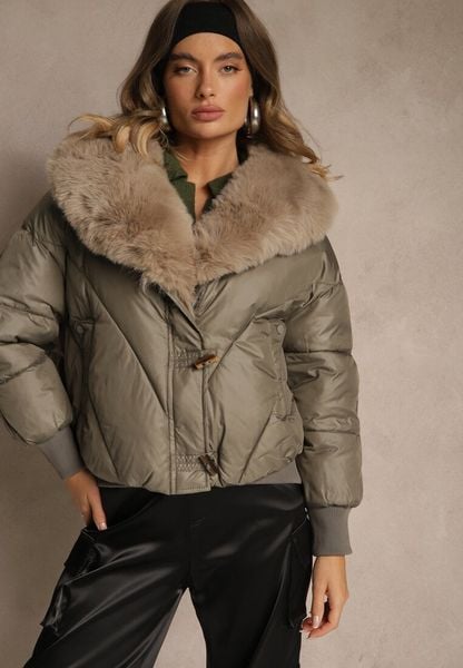 Ciemnozielona Pudełkowa Kurtka z Pikowanymi Przeszyciami i Kapturem z Futrem Ruvitta