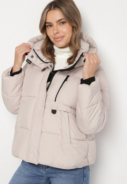 Beżowa Oversizowa Kurtka z Pikowanymi Przeszyciami i Kapturem Galimea