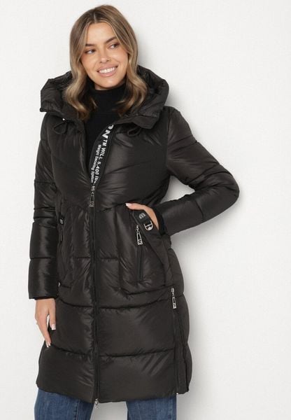 Czarna Długa Kurtka Pikowana z Kapturem i Ozdobną Taśmą przy Suwaku Galorrea
