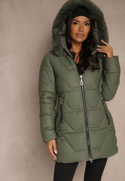 Zielona Pikowana Kurtka o Taliowanym Kroju z Kapturem z Futrem Nalessia