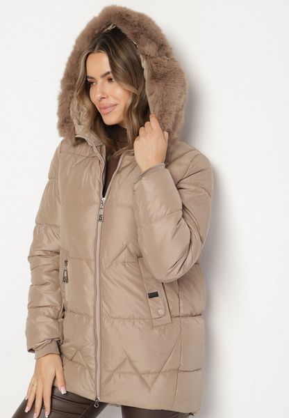 Beżowa Pikowana Kurtka o Pudełkowym Kroju z Kapturem z Futerkiem Rearria