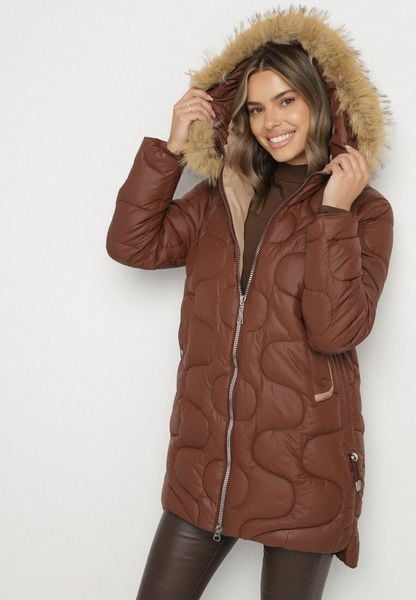 Brązowa Kurtka z Kapturem z Futerkiem Zdobiona Oryginalnym Pikowaniem Oleda