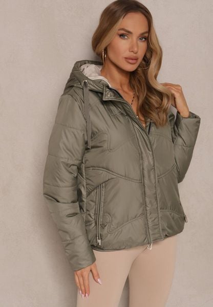 Zielona Kurtka z Pikowanymi Przeszyciami i Kapturem Zdobiona Sznurkami Evivienne