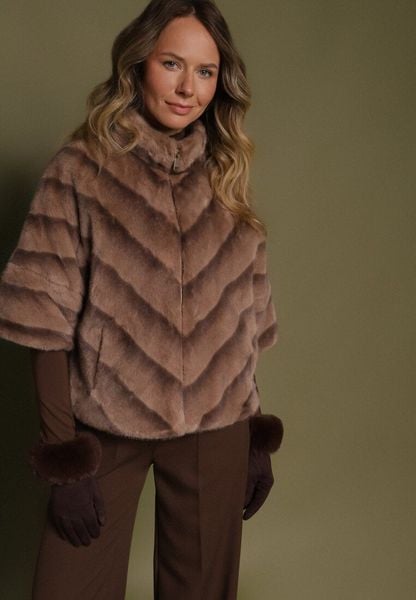 Ciemnobeżowa Kurtka Futerko o Trapezowym Kroju z Rękawem 3/4 Tadeira