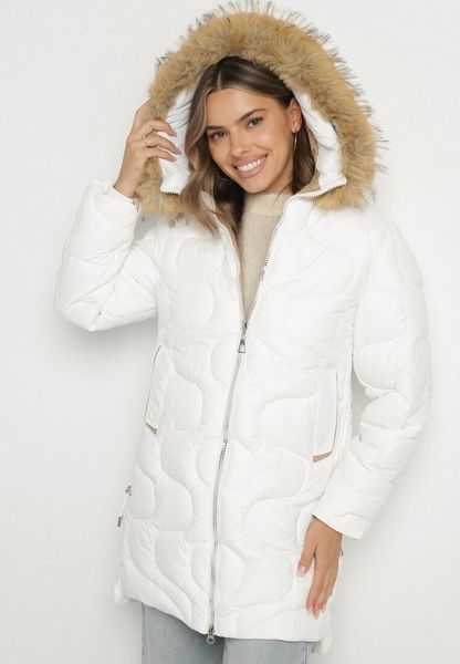 Biała Kurtka z Kapturem z Futerkiem Zdobiona Oryginalnym Pikowaniem Oleda