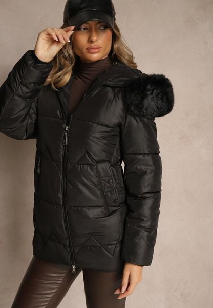 Czarna Pudełkowa Kurtka z Pikowanymi Przeszyciami i Kapturem z Futerkiem Vebina