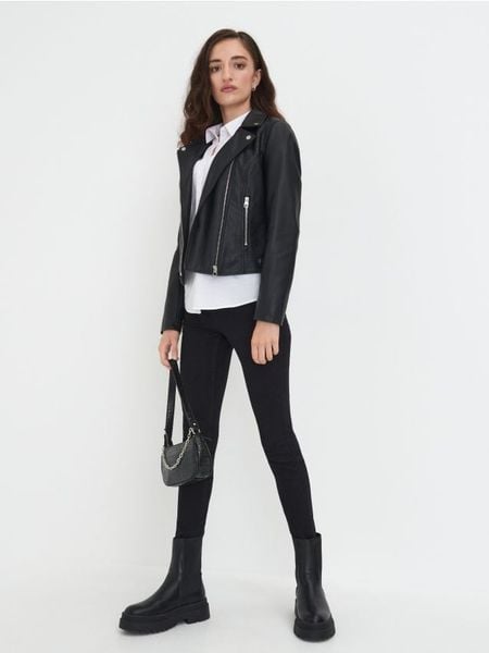Kurtka ramoneska ze srebrnymi dodatkami. Wykonana z imitacji skóry.